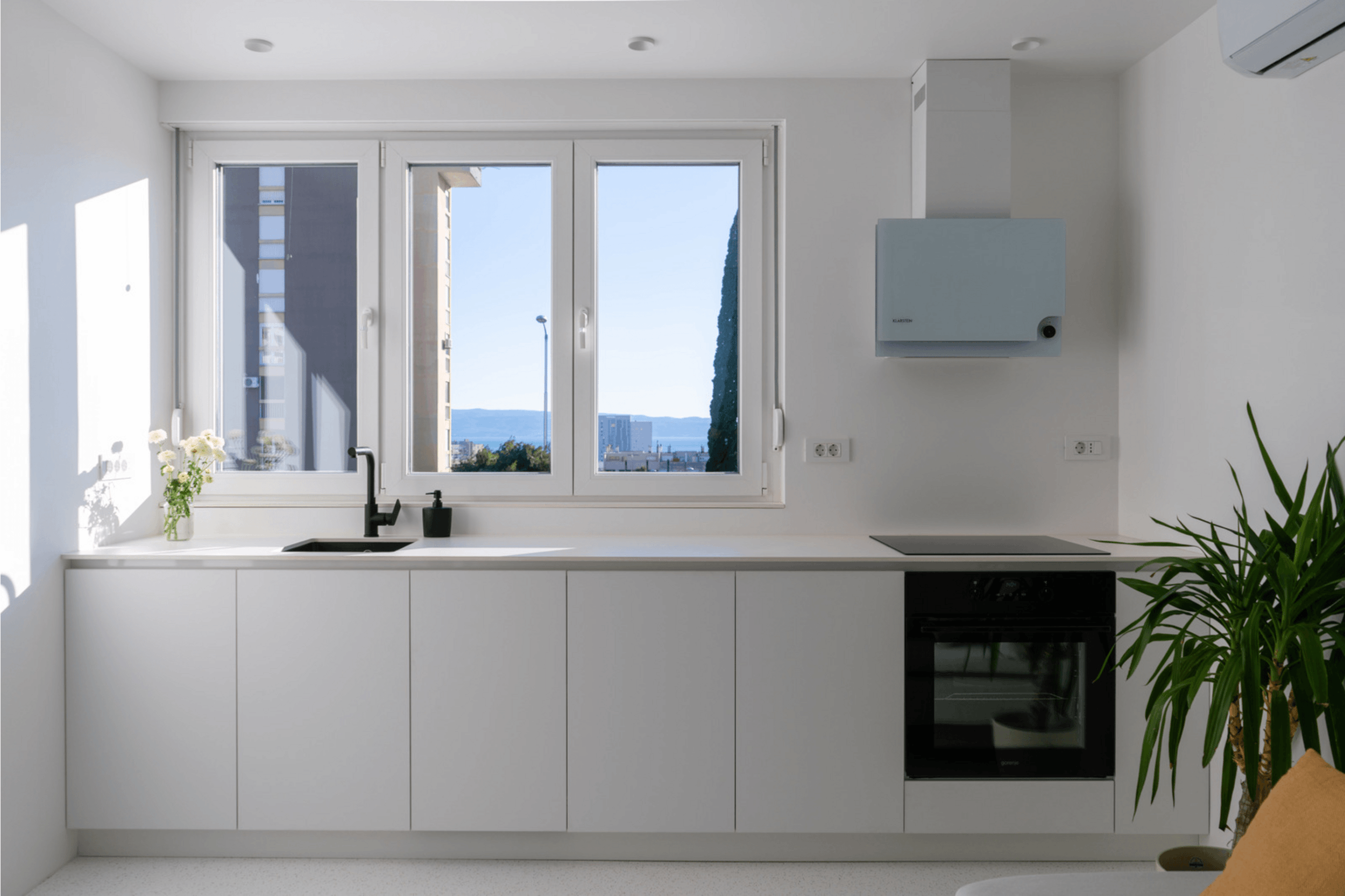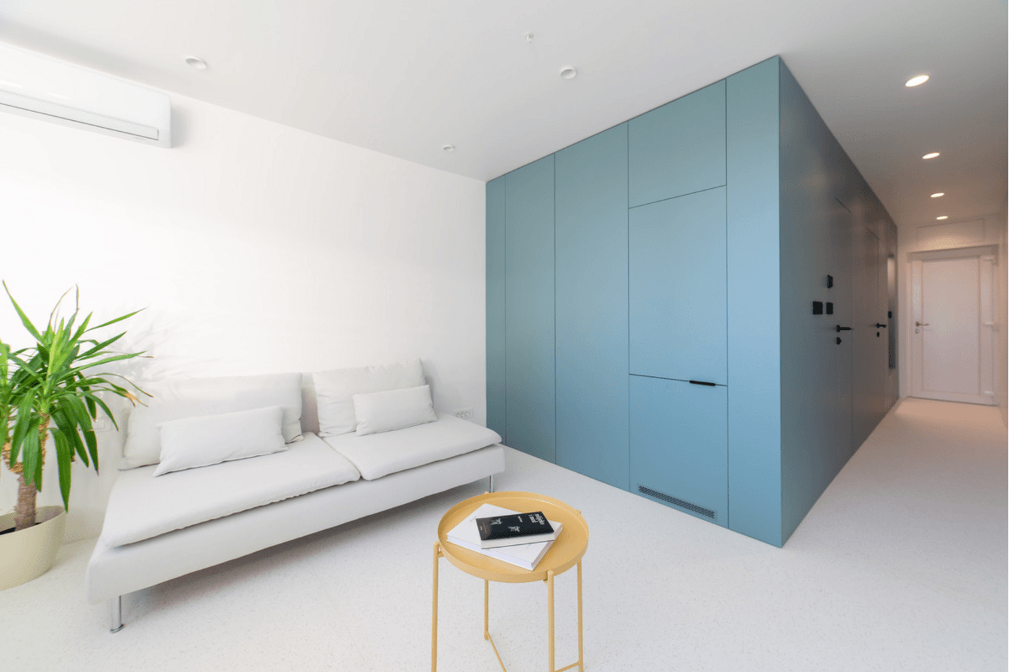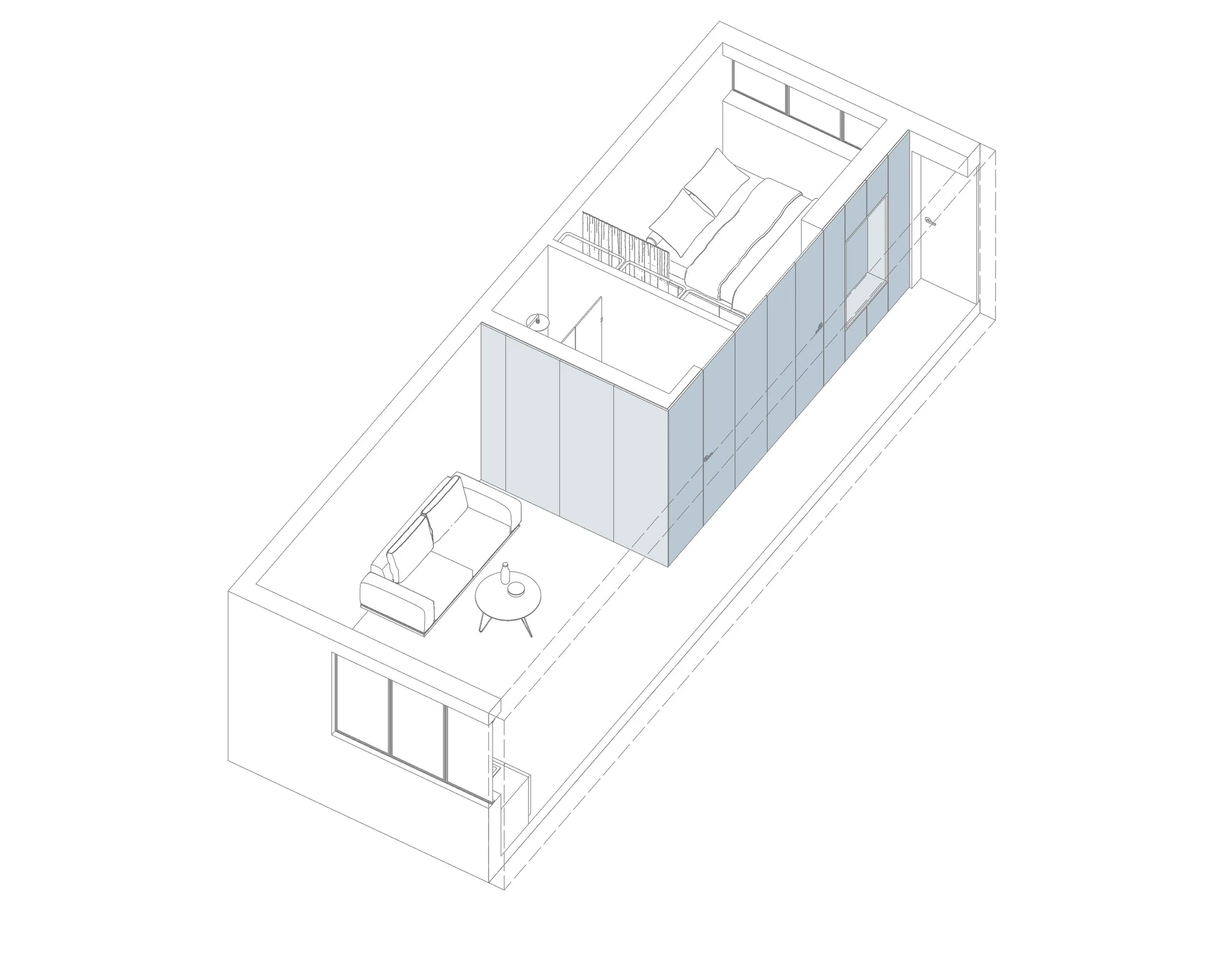The project is the complete construction of a studio apartment with an area of 31 m2. The goal was to turn a bright studio apartment with dimensions of 9.60 x 3.25 m into a one-room apartment for a family of three through precise design. The project solution maximized the double-sided orientation of the apartment, and the bedroom, bathroom, service area, living room and kitchen are arranged from north to south, and the kitchen in the very south is placed under a large opening with a view of the city and the Brac canal. The room, bathroom and service are condensed inside a geometrically clear and clean blue box that contrasts with the rest of the white surfaces inside the apartment. The white semi-reflective paint on the walls, ceilings and floor draws daylight deep into the space, making it more comfortable to stay in. By compressing several functions of the living space within one carpentry item, the spaciousness limited by the found dimensions of the apartment is largely preserved.