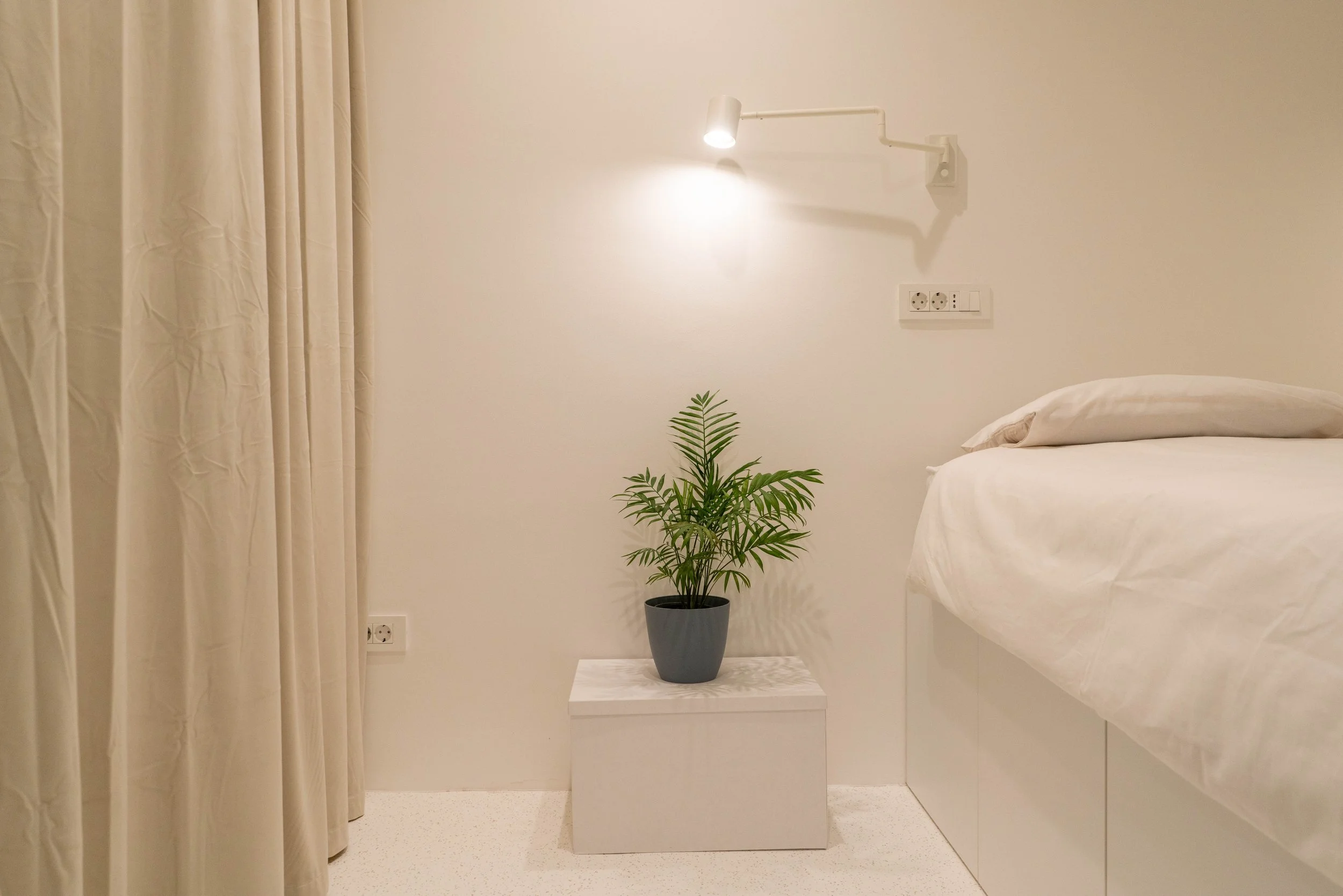 Projektni zadatak je potpuna ekonstrukcija garsonijere površine 31 m2. Cilj je bio preciznim projektiranjem pretvoriti garsonijeru svijetlih dimenzija 9,60 x 3,25m u jednosoban stan za tročlanu obitelj. Projektnim rješenjem je maksimalno iskorištena dvostrana orijentacija stana, te su sa sjevera prema jugu nanizani prostori spavaće sobe, kupaonice, servisa, dnevni boravak te kuhinja na samom jugu postavljena pod veliki otvor sa pogledom na grad i brački kanal. Soba, kupaonica i servis su kondenzirani unutar geometrijski jasne i čiste modre kutije koja je u kontrastu sa ostatkom bijelih ploha unutar stana. Bijela polureflektirajuća boja na zidovima, stropovima i podu uvlači dnevno svjetlo duboko u prostor, čime ga čini ugodnijim za boravak. Komprimiranjem više funkcija stambenog prostora unutar jedne stolarske stavke se u velikoj mjeri zadržava prostornost ograničena zatečenim gabaritima stana.